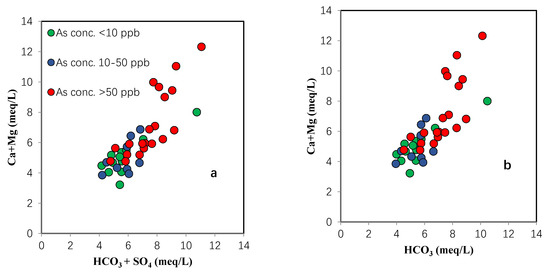 The bivariate plots between Ca + Mg and HCO3 + SO4 indicate both carbonate and silicate weathering with dominancy of silicate weathering processes as majority of data points are falling below the equal line (Figure 7a). The data points on the equal line represent the calcite and gypsum weathering processes and if they are plotted below the equal line, it implies that the excess of HCO3 + SO4 shall be balanced by alkalines (Na + K) provided through silicate weathering. The Ca + Mg should be equal to HCO3 if they derived from carbonate source as per stoichiometric of reaction. The plot between Ca + Mg and HCO3 (Figure 7b) shows that maximum groundwater data are near the HCO3 axis which again justify the prevalence of silicate weathering. It may be observed that arsenic concentration is high when silicate weathering prevails. The plot between Ca + Mg, Na + K and total cations (Figure 7c,d) reveals that Na + K increases with increasing dissolved salts and Ca + Mg are contributing more as cations.