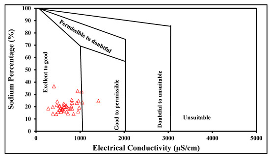 Plot of analytical data on Wilcox diagram [41] relating EC to Na% showed that 97.8% of groundwater samples of the study fell in excellent to good quality region, which can be used for irrigation purposes (Figure 10).