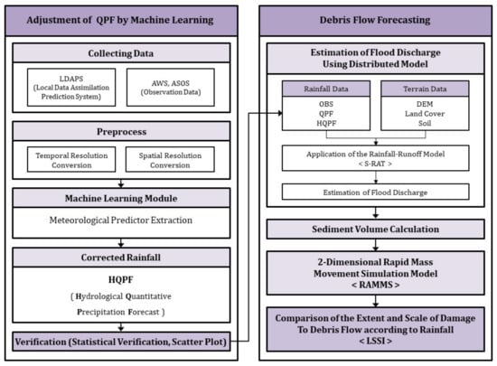 This study analyzes runoffs and debris flows in areas actually hit by debris flows by producing hydrological quantitative precipitation forecast (HQPF) using a machine learning-based prediction model and assesses its applicability to damage scale analysis. This study also reviewed precipitation forecast methods and the relevant parameters, and designed an HQPF algorithm. As for the machine learning method, this study calculated precipitation forecasts using the Random Forest (RF) method, which creates multiple training data from a single dataset and creates multiple decision-making trees through multiple learning and combines them to improve prediction power. It also verified the calculated HQPF with statistical indexes and scatter plots. Based on the collected precipitation data and topological data, runoff volumes were calculated using the spatial runoff assessment tool (S-RAT) model, and a soil volume calculation equation was used to calculate possible soil volumes. The calculations were applied to a two-dimensional rapid mass movements (RAMMS) model to simulate the scale of debris flow damages. Then, this study conducted a Lee Sallee Shape Index (LSSI) analysis on the damage area results to verify the precipitation forecast accuracy and the model’s applicability. Figure 1 shows the research flow of this study.