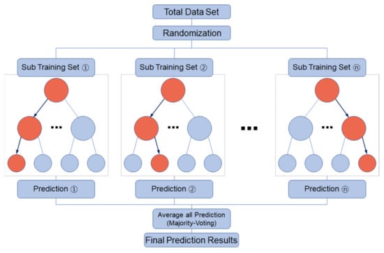 where is an indicator function 1 when the value in the parentheses is true, and 0 when the value is 0, and represents the forecast category. means the th decision-making tree. is the set of decision-making trees used to predict the category of observations in . In other words, it is the percentage of the number of decision-making trees predicted to be in , against the total number of decision-making trees used to predict [24]. Figure 2 shows the concept of random forest.