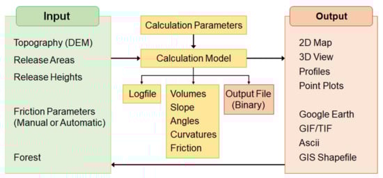 where is impact force (Kpa), is drag coefficient, is density (), and is speed (). Figure 4 represents a schematic interpretation of the RAMMS Model [27].