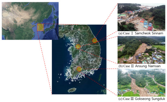 This study analyzed debris flow damage in areas damaged by debris flows in 2019 and 2020. The selected areas were Samcheok, Gangwon-do (October 2019, Event I), Anseong, Gyeonggi-do (August 2020, Event II), and Gokseong, Jeollanam-do (August 2020, Event III). In Event I, Sinnam Village in Samcheok was hit by heavy rainfall measuring 484 mm over 24 h, during which debris flow damaged 65 houses, destroyed 52 houses, and killed one person. In Event II, Namsan Village in Anseong was hit by heavy rainfall measuring 244 mm over 24 h, during which debris flow destroyed five houses and killed one person. In Event III, Seongdeok Village in Gokseong was hit by heavy rainfall measuring 494 mm over 24 h, during which debris flow destroyed five houses and killed five people. The locations and site photographs of Events I, II, and III are as shown in Figure 5.