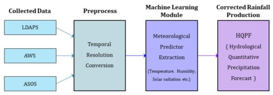 Rainfall is a non-linear event, which is not readily available for linear analysis. To overcome this limitation, this study used the RF machine learning method to improve precipitation forecast accuracy. The precipitation forecast correction mechanism was developed in three stages: Pre-processing (extracting forecast factors to be used as input data for machine learning); machine learning (using the input data for machine learning); and post-processing (generating precipitation forecast by correcting the precipitation produced through machine learning) [18]. The number of decision trees was set at 300, and the default values were used for the other parameters. The input data for machine learning included the AWS and automated surface observing system (ASOS) data from the KMA, and the forecast data extracted from the KMA’s Local Data Assimilation Prediction System (LDAPS) using the linear interpolation method. Figure 6 shows a schematic diagram of the machine learning process.