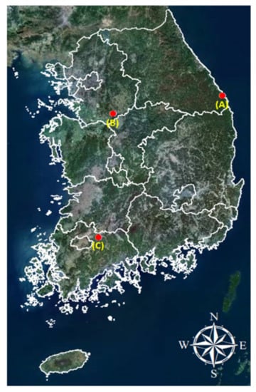 Analyzed areas. (a) Samcheok, Gangwon-do, (b) Anseong, Gyeonggi-do, (c) Gokseong, Jeollanam-do.