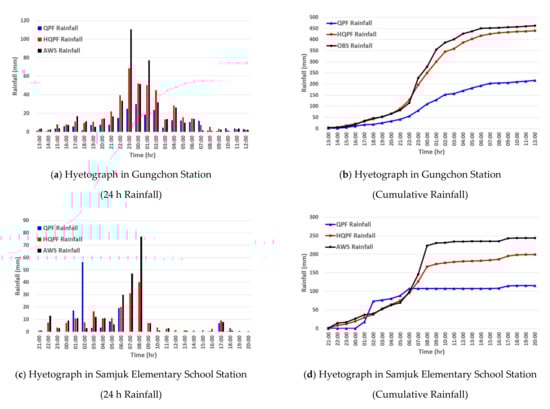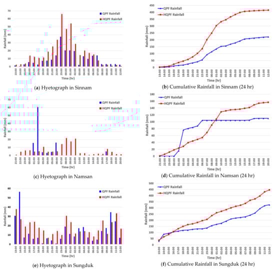 Hyetograph of the Study Area. (a) Hyetograph of Sinnam Village, (b) 24-hour cumulative rainfall of Sinnam Village, (c) Hyetograph of Namsan Village, (d) 24-hour cumulative rainfall of Namsan Village, (e) Hyetograph of Sungdeok Village, (f) 24-hour cumulative rainfall of Sungdeok Village. In the bar graphs of (a,c,e), blue is QPF Rainfall and red is HQPF Rainfall. In the solid line graphs of (b,d,f), blue is QPF and red is It means HQPF, and the dots marked for each hour mean the accumulated rainfall for that time.