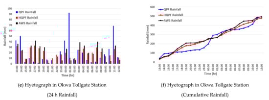 Precipitation Forecast at Nearby Precipitation Observation Stations. (a) Hyetograph of Gungchon Station, (b) 24-hour cumulative rainfall of Gungchon Station, (c) Hyetograph of Samjuk Elementary School Station, (d) 24-hour cumulative rainfall of Samjuk Elementary School Station, (e) Hyetograph of Okwa Tollgate, and (f) 24-hour cumulative rainfall of Okwa Tollgate. In each graph, black means AWS Rainfall, blue means QPF, and red means HQPF.