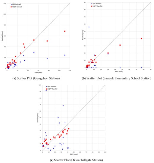 Figure 9 shows the scatter plot to identify the correlation between QPF and HQPF against the AWS precipitation data. The value of the determinant factor R2, which increases at low data disparity and decreases at high data disparity, was 0.6188 for QPF and 0.8733 for HQPF on the scatter plot of the Gunchon AWS in Event I. In Event II, the value was 0.0001 for QPF and 0.9278 for HQPF. In Event III, the value was 0.0004 for QPF and 0.883 for HQPF. The findings confirm that, across all events, HQPFs were corrected better than QPF.