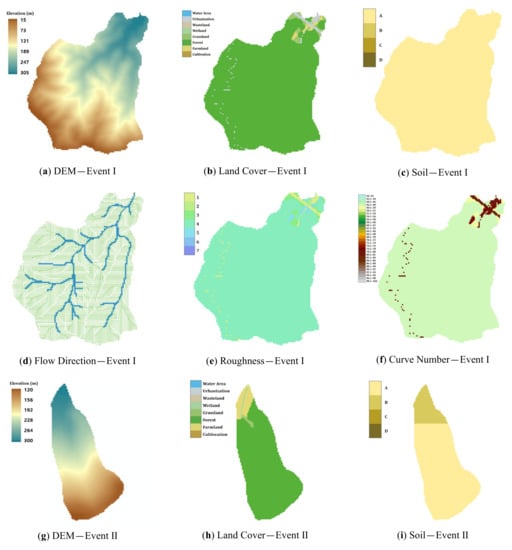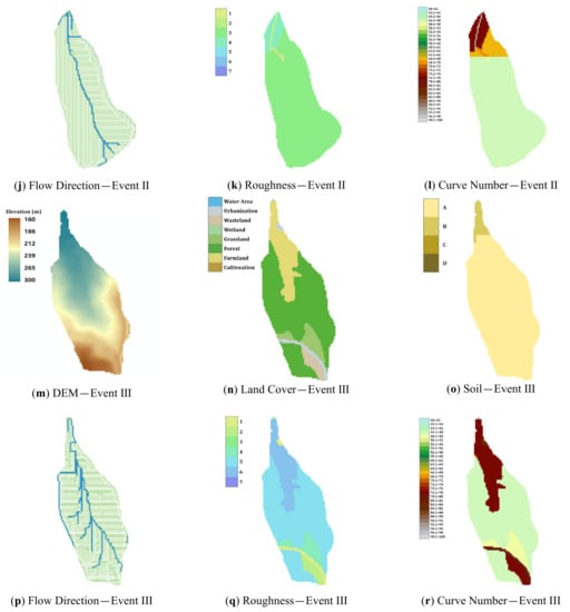We used the basic topographical data using the precipitation data and the DEM, the land cover, and the soil map. Figure 11 shows the flow direction, roughness, and curve number data from the DEM, LC, soil map, and S-RAT model for Events I, II, and III. A to D in the soil group is classified according to infiltration rate and other properties (Type A—soils with high infiltration rates, even when thoroughly wetted and consisting chiefly of deep, well-drained to excessively drained sands or gravels; Type B—soils with moderate infiltration rates when thoroughly wetted and consisting chiefly of moderately fine to moderately coarse textures; Type C—soils with slow infiltration rates when thoroughly wetted and consisting chiefly of soils with a layer that impedes downward movement of water, or soils with moderately fine to fine textures; Type D—soils with very slow infiltration rates when thoroughly wetted and consisting chiefly of clay soils with a high swelling potential). 1 to 7 in the roughness group is the matrix of the Strickler roughness for the hillslope (). For the curve number group, the modified curve number method is used.