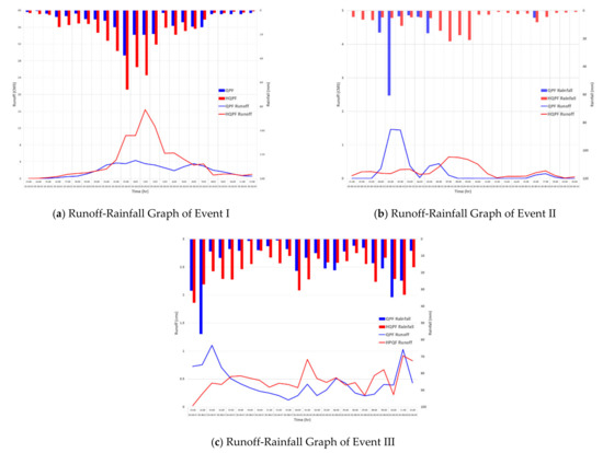 In Event I, the soil density () was 0.32, the 24-h cumulative HQPF was 415 mm, and the possible soil runoff was 84,644 m3 for HQPF. In Event II, the soil density () was 0.42, the 24-h cumulative HQPF was 157 mm, and the possible soil runoff was 14,479 m3 for HQPF. In Event III, the soil density () was 0.28, the 24-h cumulative HQPF was 448 mm, and the possible soil runoff was 18,837 m3 for HQPF.