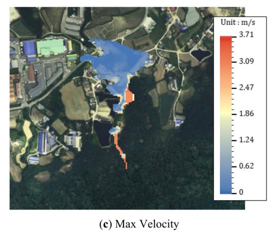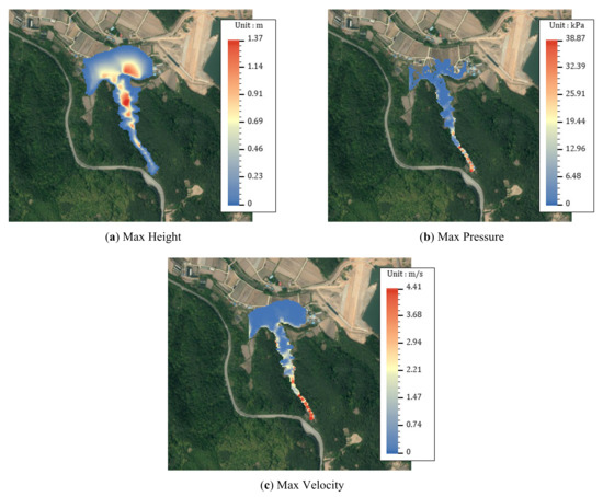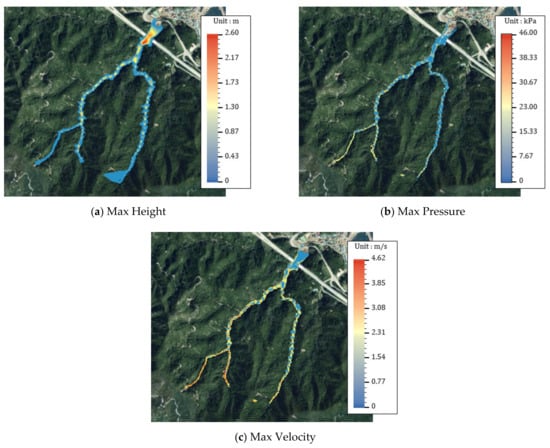 Results of RAMMS using HQPF—Event III. (a–c) are the Max Height (), Max Pressure (), and Max Velocity () in the modeling results of the debris flow in Sungduk Village, respectively.