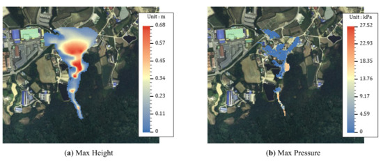 The peak runoff of the HQPF and the possible soil runoff volume () calculated with the S-RAT model and the soil volume equation were used to simulate debris flow with the RAMMS model (Table 3). In the RAMMS modeling process, the default value was used for the drag coefficient. In Event Ⅰ, the max height was 2.43 m, the max pressure was 42.68 kPa, and the max velocity was 4.62 m/s. In Event II, the max height was 0.66 m, the max pressure was 18.05 kPa, and the max velocity was 3 . In Event III, the max height was 1.32 m, the max pressure was 34.19 kPa, and the max velocity was 4.13 . The damage areas in Events I, II, and III were 62,550 , 56,325 , and 46,750 , respectively.