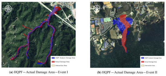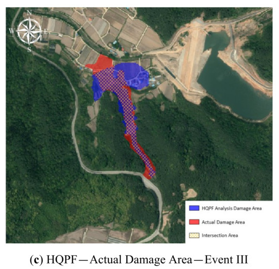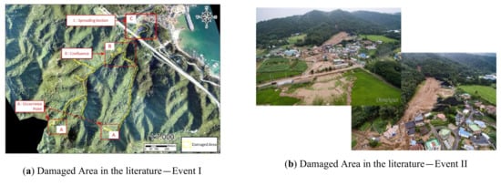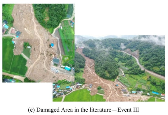 The actual damage areas for Event I were identified based on the landslide investigation report in 2019 [35]. For Event II, the drone photographs taken by Kwon Wu-seong were used [36], and the damage areas for Event III were based on the drone photographs of the site by Jang Jeong-pil at the time of the event [37] (Figure 16).