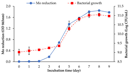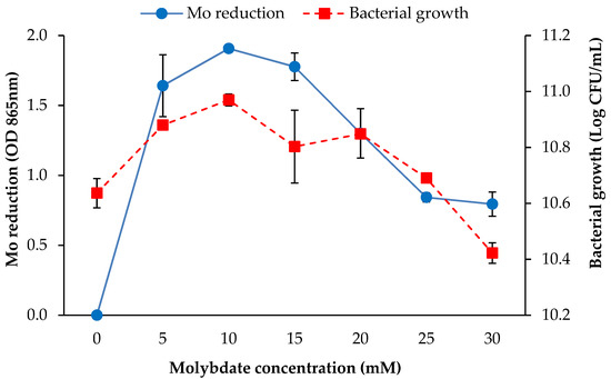 The effects of molybdate concentration on Mo reduction and growth activity of strain AQ5-05. The error bars represent the mean ± standard deviation for three replicates.
