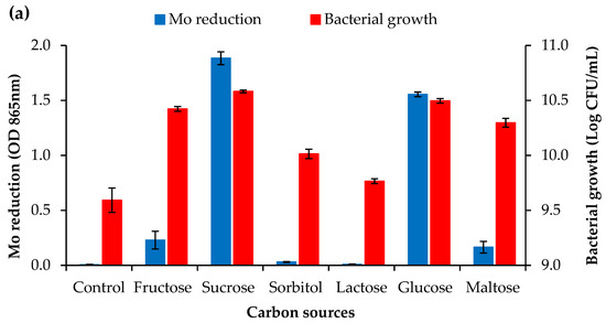 In the Mo reduction metabolic pathway, simple carbohydrates are preferred as electron donors as they can produce reducing equivalents for NADH and NADPH and are the substrates for Mo-reducing enzymes [20,21]. A few mesophilic bacterial strains such as Bacillus sp. strain Neni-10, Klebsiella oxytoca strain Saw-5, Enterobacter sp. strain Saw-1, Burkholderia vietnamiensis strain AQ5-12, and Burkholderia sp. strain AQ5-13 have been reported to favour both glucose and sucrose as the best electron donors for Mo reduction, though glucose was favoured more than sucrose except for Burkholderia sp. strain AQ5-13 [2,6,22,23]. Low ODs seen in other carbon sources, especially lactose, maltose, and sorbitol, ascertain the incapability of these sugars to produce reducing equivalents for NADH and NADPH.