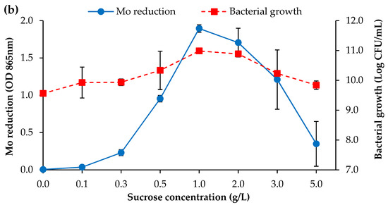 (a) The effects of various electron donors at the final concentration (w/v) of 1% on bacterial growth and Mo reduction; (b) The effects of different sucrose concentration on Mo reduction and growth of strain AQ5-05 in LPM after 168 h at 10 °C. The error bars represent the mean ± standard deviation for three replicates.