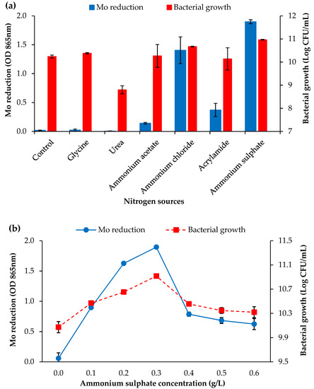 (a) The effects of different nitrogen sources at an initial concentration of 0.3 g/L; (b) the effect of different concentrations of (NH4)2SO4 on Mo reduction and growth of strain AQ5-05 in LPM. The error bars represent the mean ± standard deviation for three replicates.