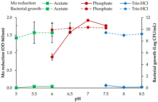 The effects of pH on Mo reduction and growth of strain AQ5-05. The error bars represent the mean ± standard deviation for three replicates.