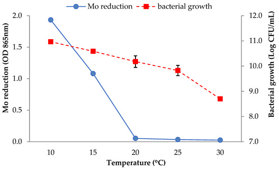 The effects of temperature on Mo reduction and growth of strain AQ5-05. The error bars represent the mean ± standard deviation for three replicates.