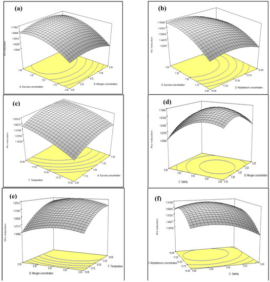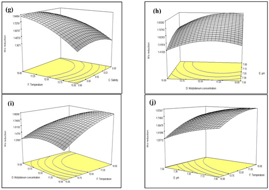 Three-dimensional contour plot showing the effect of interactions between a pair of parameters on Mo reduction by strain AQ5-05. (a) AB; (b) AD; (c) AF; (d) BC; (e) BF; (f) CD; (g) CF; (h) DE; (i) DF; (j) EF.