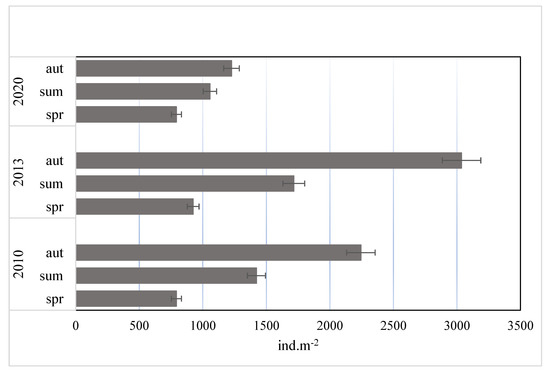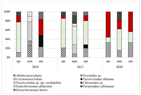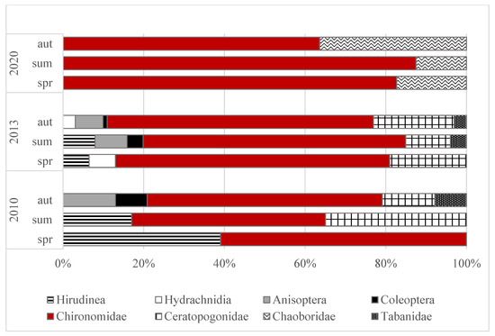The abundances of macrofauna differed significantly between the years (ANOVA, F = 28.72; p = 0.004) and seasons (ANOVA, F = 11.38; p = 0.022) (Figure 1). In individual years of the study, the highest densities of macroinvertebrates were noted in autumn (1726–3036 ind. m−2) and the lowest in spring (764–992 ind. m−2). Generally there was a clear decline in the total density of bottom fauna in 2020 in comparison to the years 2010 and 2013, primarily in summer and autumn. In total, eight taxa of macrofauna were noted in the studied peat pool. Independently of the year and season, the highest relative abundances were found for larvae of Chironomidae (Figure 2). Their proportion varied from 48.2% (summer 2010) to 87.5% (summer 2020). A total of nine chironomid taxa were identified in this study (Figure 3). The highest proportions were registered to larvae of Psectrocladius sp. (gr. sordidellus) (11–66%), Chironomus sp. (7–56%), and Procladius sp. (8–33%).