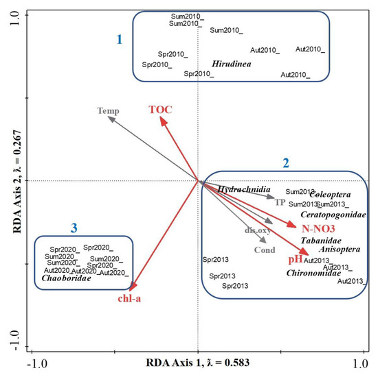 RDA triplot showing macroinvertebrate taxa, environmental variables, and samples. Solid red arrows indicate significant variables based on Monte Carlo permutation test (p < 0.05). Spr2010, Sum2010, Aut2010-samples collected in spring, summer, and autumn 2010; Spr2013, Sum2013, Aut2013-samples collected in spring, summer, and autumn 2013; Spr2020, Sum2020, Aut2020-samples collected in spring, summer, and autumn 2020.