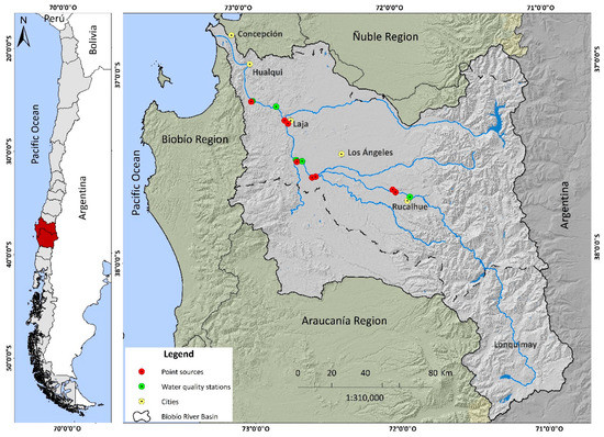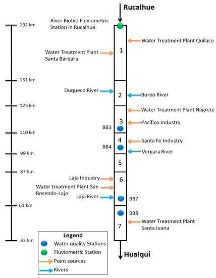 This study considers a 159.6 km of the Biobío River between the cities of Rucalhue and Hualqui (Figure 1). The selection of the section considered the existence of different point sources (sewage treatment plants and industrial effluents). The fluviometric and water quality records were obtained from the Chilean Water Authority (DGA) [50] and the Biobío River Monitoring Program (PMBB) of the EULA (European-Latin America) Center—Chile.