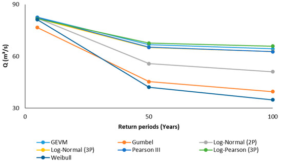 Adjustment of distributions for minimum flows in return periods of 5, 50, and 100 years.
