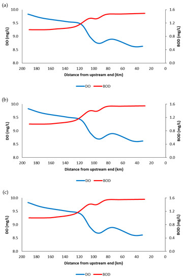 Figure 4 shows the simulations made with Qual2K by the three extreme minimum flow scenarios. Figure 4a shows the DO and BOD concentrations by minimum flow with a return period of 5 years (82.59 m3/s). The BOD concentration increases downstream, reaching its maximum concentration at 46.3 km, and is equivalent to 1.49 mg/L, while the dissolved oxygen concentration decreases downstream, reaching its minimum concentration at 46.3 km, equal to 8.63 mg/L. Figure 4b shows the concentration of DO and BOD for a minimum flow with a return period of 50 years (66.82 m3/s). It shows that the concentration of dissolved oxygen decreases downstream, reaching a minimum concentration of 8.617 mg/L. The BOD concentration increases downstream, reaching a maximum concentration of 1.55 mg/L at 46.3 km. Figure 4c shows the DO and BOD concentration for a minimum flow with a return period of 100 years (64.32 m3/s). BOD concentration increases downstream, reaching a maximum of 1.56 mg/L at 46.3 km, while dissolved oxygen concentration decreases, reaching a minimum concentration of 8.615 mg/L at 46.3 km.
