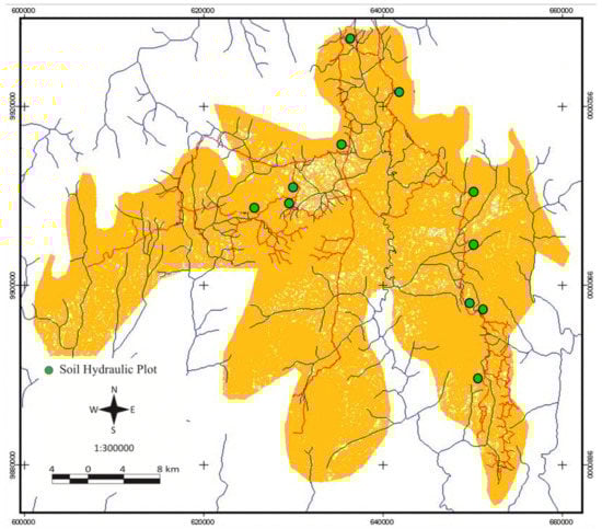 Saturated hydraulic conductivity (Ks) is one of the most important hydraulic properties affecting water flow in soils. Soil type, spatial, and seasonal variability, in addition to scale dependency, are key factors that make it more difficult to accurately measure the saturated hydraulic conductivity [,]. Saturated hydraulic conductivity (Ks) is one of the properties of the flowpaths in almost all modes of streamflow generation [,]. This parameter was estimated from infiltration measurements taken in each plot, using the falling-head method []: