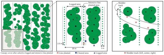 The Intensive Forest Management System (IFMS) is a new forest management system for tropical Indonesian forests. The main activities are timber harvesting using a selective logging method and forest rehabilitation with intensive line planting. A stricter cutting regime coupled with several additional selective logging controls is imposed to minimize the impact of logging on skid trails. This includes the alignment of skid trails along the contour, construction of cross-drains at 45–60° along the skid trails, and skid trail deactivation at the end of the skid trail line. Furthermore, no logging is allowed within a buffer area of at least 20 m on both sides of perennial streams. The IFMS phase after selective logging is forest rehabilitation with intensive line planting. Intensive line planting involves line clearing and line rehabilitation. About 15–20% of the forest area is a clear-cut line to enrich the standing stock using an intensive strip-line planting system.