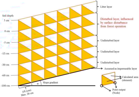 Based on the soil profile investigation, surface soil disturbance from IFMS operations was found to have an effect at a soil depth of 0–15 cm. The scenario setting for the two-dimensional saturated soil water flow simulation model is shown in Figure 3. The soil layer depths were based on the soil profile investigation. We found no difference in the soil layers between −60 to −100 cm and −100 to −150 cm, therefore we used the soil layer of −60 to −100 cm to represent the parent material horizon. The slope gradient was given the same gradient, of 30°, as the average measured in the operational blocks. The element of the calculated area was designed with a maximum length of 20 cm for the detailed calculation at the point output (node).