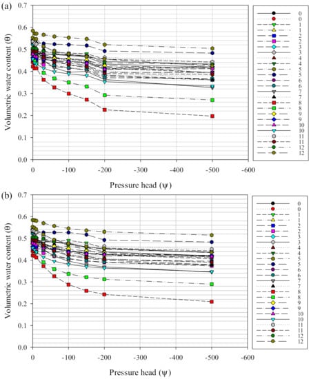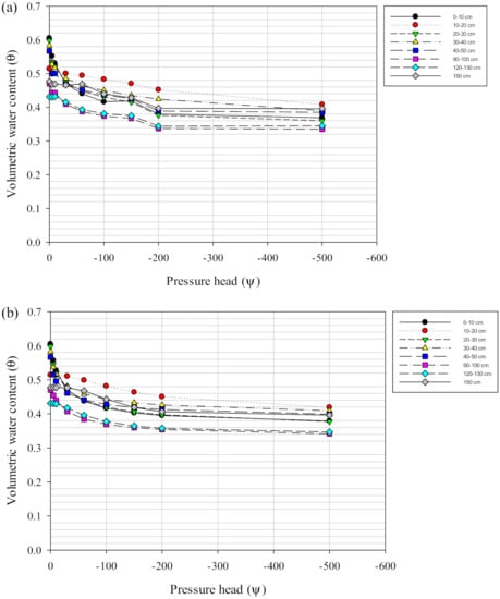 In the laboratory, a water retention test using a pressure plate was used to measure the volumetric water content, θ. Undisturbed soil core samples were placed on an aluminum tray and slowly saturated by adding water from the bottom over a 24 h period. Soil water retention curves were measured using the pressure plate method [] for matric pressure heads (ψ) of −5, −10, −30, −60, −100, −150, −200, and −500 cm. After measuring the water content at ψ = −500 cm, the soil samples were resaturated from the bottom over a 24 h period.