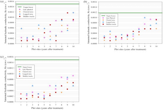 Field observations of soil hydraulic properties were conducted on 11 plots, including 1 virgin forest plot and 10 plots at different operational blocks of the IFMS, as shown in Figure 1. Field measurements of infiltration were made using a portable double-ring infiltrometer. The inner ring was 13 cm in diameter and 24 cm high, and the outer ring was 30 cm in diameter and 15 cm high. A total of 123 infiltrometer tests were performed in the 10 plots of forest operation blocks from the first year until 10 years after forest treatments began, and in the undisturbed forest (virgin forest) plot. In each plot of the IFMS, the infiltrometer test was performed at four locations with three repetitions based on differences in topography: a line-planted area, cleared area, logged area, and an area with skidder tracks, as shown in Figure 2. In the virgin forest plot, the infiltrometer test was performed at upper, middle, and lower slopes of virgin forest blocks. These test sites were selected using a random sampling method. The tests were conducted after a minimum of 2 days without rainfall [].