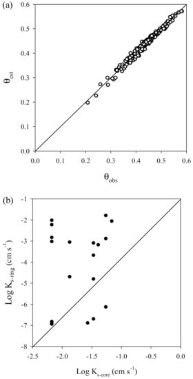 Figure 8a shows the relationship between observed and estimated θ using the LN model. There was good correspondence between observed and estimated values (data fall closely around 1:1 line), indicating that the retention model can adequately express the observed water retention curves. Figure 8b shows the relationship between Ks measured from the ring infiltrometer test (Ks-ring) and soil core samples (Ks-core). The data are widely scattered, which indicates that the results from the infiltrometer tests did not adequately correspond to the Ks values from soil core samples. This may be due to several factors, such as the different locations, sample size, time period, and the different number of samples. Direct measurements of Ks (either in the laboratory using soil core samples previously taken from the field, or directly in the field without removing a soil sample) are preferred to indirect methods (derived from soil textural characteristics). Field methods provide data that better represent the reality of water flow in natural conditions [,,].