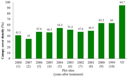 Average canopy cover density measured in permanent sample plots at different IFMS sites and the virgin forest site.
