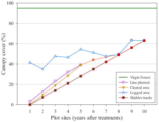 Figure 10 was developed based on the PSP measurements and field observations. The canopy covers for line-planted, cleared, and skidder-tracked areas were assumed to be similar to those of logged areas in the 8 to 10 year old sites. In the 5 to 7 year old sites, the canopy cover in cleared areas was assumed to be similar to that of line-planted areas. The data on the canopy cover of line-planted areas, when plotted on a graph, followed a curved line that was assumed to represent a vegetation growth curve. In 1 to 4 year-old sites, there were different canopy covers between line-planted and cleared areas, with line-planted areas having more canopy cover than cleared areas that had 1–4 years of succession. No vegetation was planted on skidder tracks; thus, the canopy cover on skidder tracks was affected by the surrounding vegetation. Therefore, the canopy cover on skidder tracks in 1 to 10 year old sites was assumed to occur in straight line.