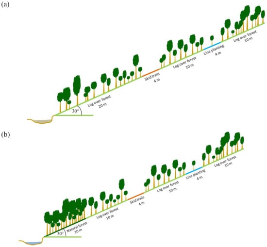 A river buffer is used to reduce the impact of logging on runoff and erosion. This simulation combined a buffer area with each treatment area, as shown in Figure 11. The slope gradient was assumed to be 30°, based on the average slope gradient in the study sites.