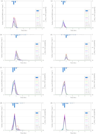 Surface runoff hydrograph generated from rainfall events of: (a) 17.8 mm, (b) 21.2 mm, (c) 27.2 mm, (d) 29.2 mm, (e) 37.6 mm, (f) 41.4 mm, (g) 53.4, and (h) 66.6 mm.