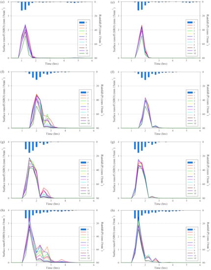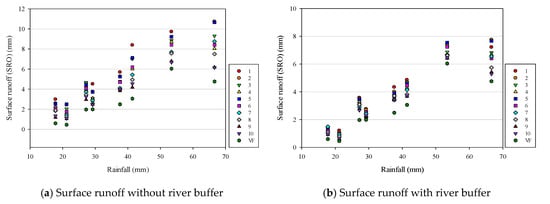 Several rainfall events were used to generate the surface runoff hydrograph in the scenario without a river buffer (left) and with a river buffer (right) shown in Figure 12.