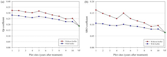 Soil hydrologic properties at the disturbed sites were changed and produced higher Qp and SRO coefficients, compared to the VF site (Figure 14). However, the Qp and SRO coefficients declined at disturbed sites over time, indicating that soil hydraulic properties slowly recovered. A smaller Qp coefficient indicates a greater potential for a forested catchment to reduce Qp (Figure 14a). In the early years after IFMS treatment, large gaps in Qp and SRO were found between the scenarios with and without buffer areas. The buffer area can effectively reduce the Qp and SRO coefficients, which declined at each site over time. The buffer area canopy serves as a barrier against precipitation reaching the ground. The high canopy cover density in the buffer area controlled the net precipitation via canopy interception. The treated area had less canopy cover, compacted soils, and low infiltration capacities. Consequently, these conditions reduced the forest interception, evapotranspiration, and infiltration volumes, creating a quick surface runoff response and increasing the percentage of rainfall to surface runoff in the model. Undisturbed soil hydraulic properties played a major role in the high infiltration capacity. The combination between high canopy interception and high infiltration capacity in the buffer area had a significant role in the SRO reduction that occurred in the early period following treatment (Figure 14b). Ten years following the initiation of the IFMS, the SRO coefficient of the disturbed sites was reduced and was similar to that of the VF site. These results suggest that the disturbed sites need at least 15 years to recover their soil hydraulic properties to levels similar to those at the VF site.