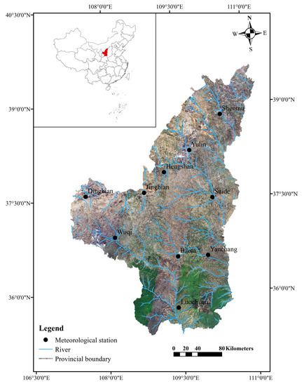 The data in this paper came from the National Meteorological Information Center of China Meteorological Administration (http://data.cma.cn, accessed on 9 March 2021). The daily precipitation data of 10 meteorological stations in Northern Shaanxi during 1960–2019 were used to quality collate the original data and make up the difference. The spatial distribution of meteorological stations in the study area is shown in Figure 1.