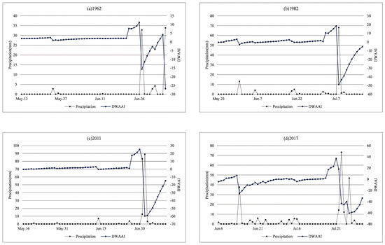 In order to discuss the applicability of dry–wet events abrupt alternation index in northern Shaanxi, this study took Yulin station as an example to verify. According to the historical disaster data, different degrees of dry–wet events abrupt alternation in 1962, 1982, 2011 and 2017 were selected in northern Shaanxi, and the precipitation process and DWAAI values in dry spells and wet spells were verified by comparing the four dry–wet events abrupt alternation in Yulin city. As can be seen from Figure 2a, in the dry–wet events abrupt alternation in 1962, the cumulative precipitation in the dry spell was 3.98 mm, and the cumulative precipitation in the wet spell was 35.6 mm. 26 June was the occurrence date of the dry–wet events abrupt alternation, the DWAAI value was 11.3, and the grade was light. In Figure 2b, before 7 July 1982, the cumulative precipitation in the dry spell was 30.22 mm, and the cumulative precipitation in the wet spell was 71.24 mm. In addition, on 8 July, the daily precipitation reached 68mm. The degree of “urgency” was high, and the DWAAI value reached 18.3. Figure 2c,d show the dry–wet events abrupt alternation on 30 June 2011, and 21 July 2017, respectively. The DWAAI values of these two events are 25.15 and 36.95, respectively, and their levels are both severe. By comparing Figure 2c,d, it can be seen that the cumulative precipitation in the first two days of the wet spell in 2011 reached 101.3 mm, and the cumulative precipitation in the first two days of the wet spell in 2017 was 87.4 mm, and the precipitation in the last day of the wet spell was 46.8 mm. The degree of “urgency” of the two events is similar. Compared with the calculated results, DWu in 2011 is 6.44, and DWu in 2017 is 6.3, which is similar. In 2011, the cumulative precipitation in dry spell was 14.3mm, and the cumulative precipitation in wet spell was 106.1 mm. In 2017, the cumulative precipitation in the dry spell was 75.6 mm, and the cumulative precipitation in the wet spell was 146.3 mm. However, since the precipitation in the dry spell in 2017 mostly concentrated before 6 July and had little impact on the dryness on that day, the “alternation” degree of events in 2017 was much greater than that in 2011, and the DWAAI values were significantly different. Through the above comparison and verification, it is indicated that DWAAI index is suitable for the study of dry–wet events abrupt alternation in northern Shaanxi.