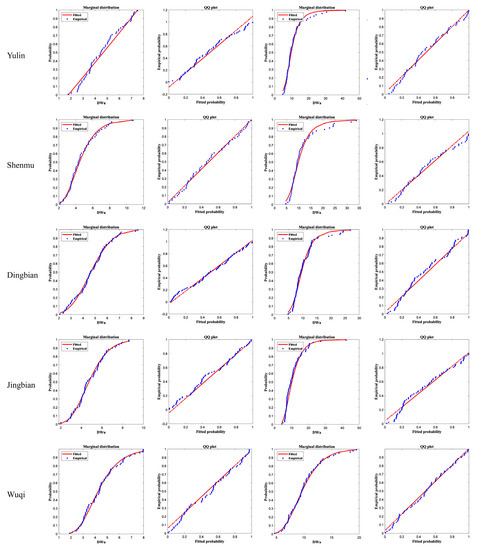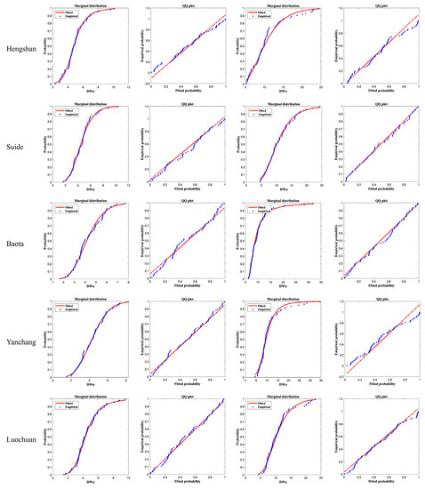 In this study, MVCAT software package in matlabR2020a was used for calculation, and 25 copula functions in the program were selected for fitting. The three copula functions with the best goodness of fit are selected and listed in descending order of goodness, as shown in Table 5. As can be seen from the table, except for Baota station, the optimal copula functions of the remaining nine stations are Roch-Alegre Copula, Fischer-Hinzmann Copula, Joe Copula and Burr Copula. The root mean square error (RMSE) and Nash-Sutcliffe efficiency coefficient (NSE) values and the standard deviation (SD) of observed values are also shown to evaluate the goodness of fit of the Copula function. When the NSE value is in the range of 0~1, the model performance is considered acceptable, when the NSE value is less than 0, the model performance is considered unacceptable, and when the NSE value is greater than or equal to 0.55, the model performance is good. The range of RMSE value is greater than or equal to 0 [43]. The closer the RMSE value is to 0, the better the model fitting effect is. Moreover, when the RMSE value is less than half of the SD value, it could also be considered as low and the model performance is acceptable [44,45]. As you can see from Table 5, the NSE values are high and acceptable; RMSE values are all less than half of the SD values and are acceptable. Further, the smaller the RMSE value and the larger the NSE value are, the better the fitting effect of the Copula function is. It should be noted that in The Jingbian station and Hengshan station, although the RMSE and NSE values of the Fischer-Hinzmann Copula indicate that it is the optimal copula function, nonetheless, one of the parameters of the calculated Fischer-Hinzmann Copula and Roch-Alegre Copula converge to the parameter boundary, they may not be a good fit, so the optimal copula function of Jingbian station and Hengshan station is selected Joe Copula.