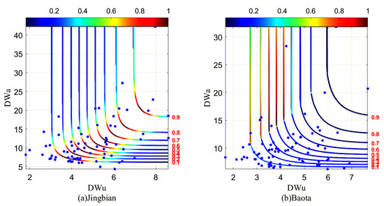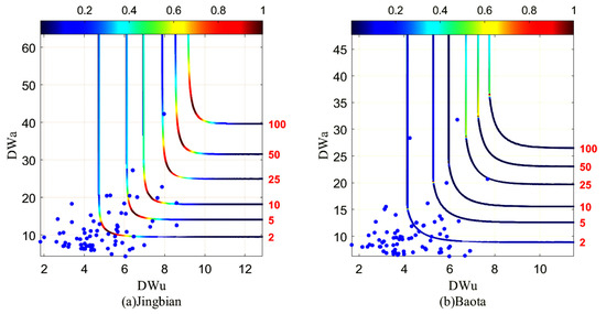 In this study, two-dimensional copula function was used to fit the joint distribution of DWu and DWa, and the joint distribution probability and joint return period were obtained. The copula function is essentially the multivariate joint distribution function of the random variable X1, X2,…, XN with an edge distribution of FX1(x1), FX2(x2),…, FXN(xN). The two-dimensional copula function can combine DWu and DWa, and the formula is as follows: