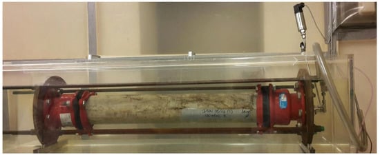 The unearthed AC pipe segments were subjected to strength tests in the lab of the Section Materials & Environment of the faculty of Civil Engineering and Geosciences at Delft University (Delft, The Netherlands). The pipe segments were tested by placing them in a container filled with water and then gradually increasing the water pressure at the inside of the pipe until catastrophic failure. The pipe segment was sealed at two ends, as shown in Figure 1, one end being connected to a high-pressure pump that pumped water into the tested pipe at 25 mL/min. Each time, pumping proceeded until the gradual increase in pressure led to either pipe failure through cracking or to leakage of the seals at the end (seals typically failing at pressures upwards of 50 bar, well beyond the operation limits of the seals in drinking water practice). Whether a specific pipe failed during the strength tests is summarized in Table 2.