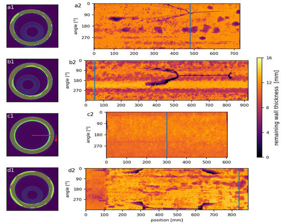 Figure 4 displays several comparisons of profiles made with the ultrasound technique (blue lines) with profiles extracted from the CT data (black lines for the local original wall thickness as determined from the CT data, red lines for the remaining wall thickness). The lettering of the profiles in Figure 4 corresponds to the lettering of Figure 2, and the profiles belong to the cross-sections shown in Figure 2 (a1–d1). For a correct comparison, it is important to note that a CT slice corresponded to a 1.5 mm cross-section of the pipe, which was relatively precise compared to the location of the ultrasonic measurement, which was carried out by hand. To account for human error, the minimum and maximum wall thickness encountered in a 1 cm band around the intended location (0.5 cm on both sides) were marked by the red area around the CT profile.