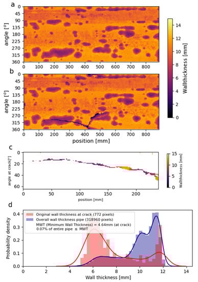 Figure 3 shows an example of how this was approached for pipe 177598: the location of the crack that resulted from the strength tests was obtained from the scans that were taken after the tests (Figure 3b). Subsequently, that information was combined with the scans that were taken prior to the strength tests (Figure 3a) to determine the original remaining wall thickness along the trajectory of the crack (Figure 3c). Since the crack’s exact point of initiation could not be obtained from the CT scans, the part of the crack between forks was taken to be the first part of the crack, which formed directly after initiation. The distribution of remaining wall thicknesses along this part was compared to the distribution of the remaining wall thicknesses across the complete pipe wall (Figure 3d). In this particular case, indeed, one of the lowest values for the remaining wall thicknesses was found on the crack, and the wall thicknesses along the crack were clearly lower than those that were present elsewhere on the pipe, although there was a clear overlap in distributions as well. The minimum wall thickness on the crack belonged to the 0.07% lowest anywhere on the pipe.