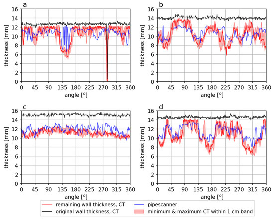 Comparison of CT (red) and ultrasound (blue) measurements of the remaining wall thicknesses of the four cross-sections of degraded pipes shown in Figure 2 (the lettering (a–d) corresponds to pipes with the same letters in Figure 2). The black lines represent the original wall thickness (comprising degraded and undegraded material) as determined from the CT scans.