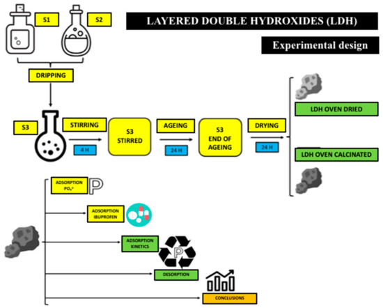 Additionally, a fraction of this composite was subjected to calcination in a muffle for 2 h at 600 °C in order to evaluate the effect of calcination on the pollutant retention (named in this case as LDHC). A flowchart of the methodology followed in this study is shown in Figure 1.