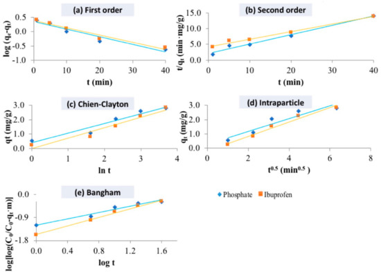 Kinetic plots for the adsorption of phosphate and ibuprofen onto calcined layered double hydroxide (LHDC) applying different kinetic models: (a) pseudo-first-order, (b) pseudo-second-order, (c) Chien–Clayton model, (d) intraparticle diffusion model, and (e) Bangham model.